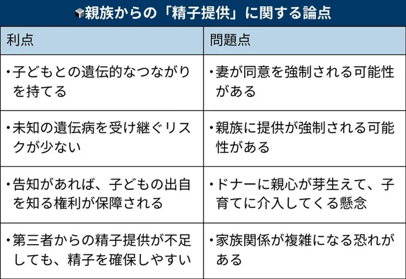 親族(父・兄弟)からの精子提供にて不妊治療をすること。ただし対応している医療機関は非常に少なく、現状、治療する場合は公表せずにこっそり実施しているところを探すしかない。日本に精子提供に関する法律はなく、1997年に「日本産科婦人科学会」が作った指針では、精子のドナーは「匿名の第三者に限る」となっています。親族間だと「家族関係が複雑になる」という立場です。生まれてきた子が自らのルーツを知ることはできず、「夫に似た子を育てたい」という思いには耳を傾けないままになっています。(参考記事)
